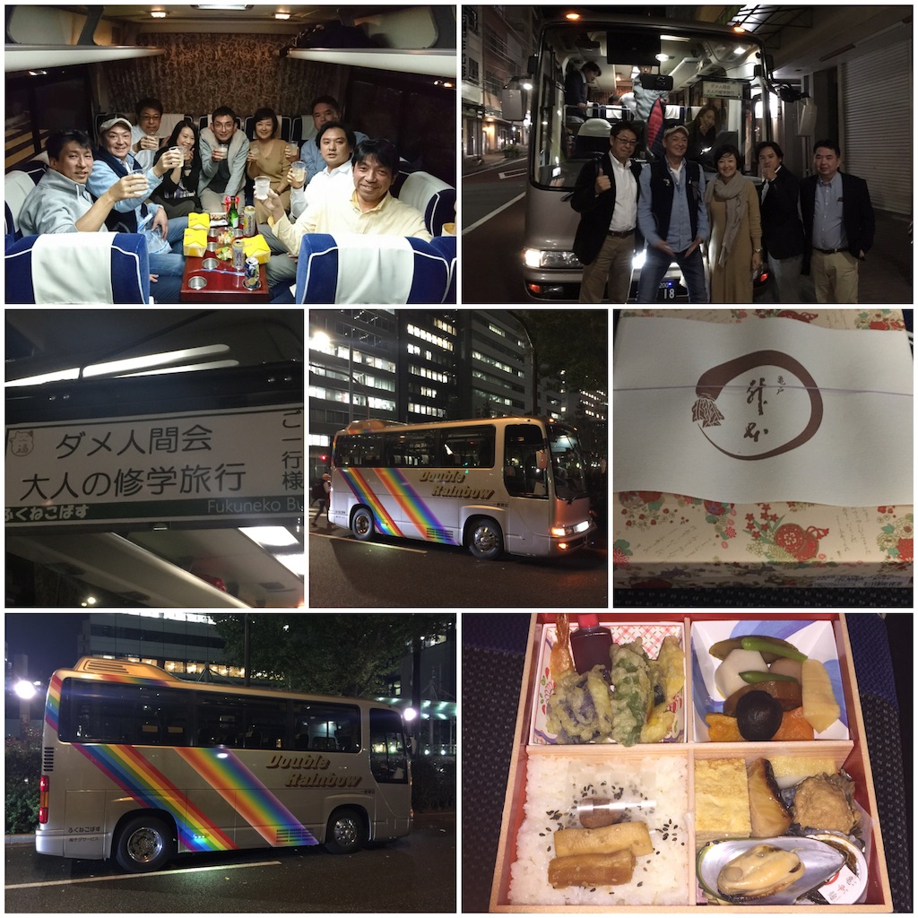 2017-11-12 ダメ人間会 大人の修学旅行 2017(熱海)① 食事・グルメ 旅行・おでかけ この記事をシェアする Facebook Twitter Pocket LINE 久々の大型企画に参加してきました。 題して“ダメ人間会 大人の修学旅行”。 今回の目的地は熱海です。 金曜夕方に集合して、チャーターバスで美味しいお弁当を肴に呑み。 ホテルについて、翌日ゴルフにもかかわらず、呑み。 まさに大人の修学旅行。 全員家庭持ちにも関わらず、こんな企画が成り立つ仲間がいるって、凄いことですよね? とりあえず、初日は25:30 まで呑んで、終了いたしました。 ƪ(˘⌣˘)ʃ ↓ ランキングに参加しています。よろしければポチポチして下さい。 もっと読む コメントを書く